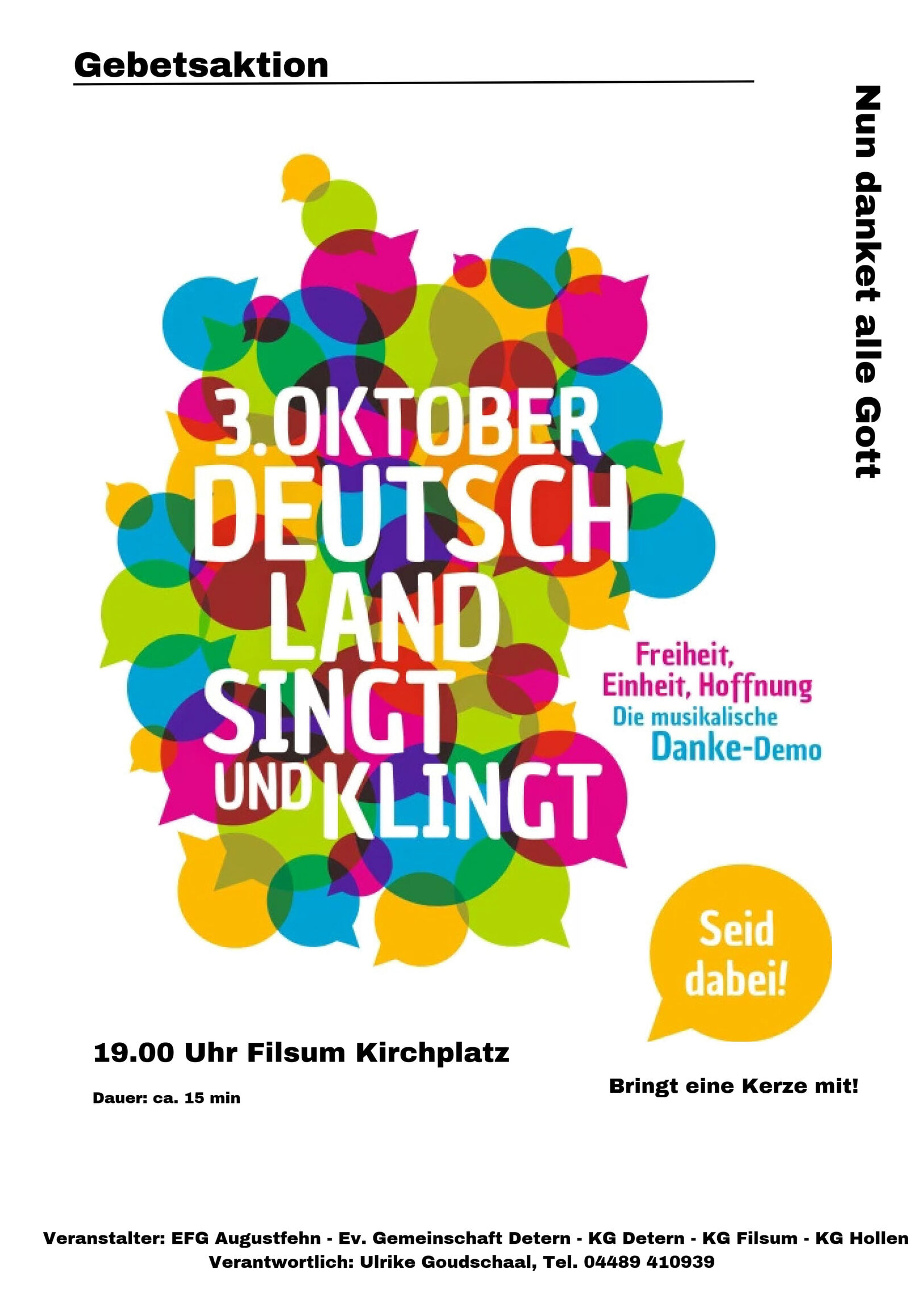 Unserer Dankbarkeit können wir am 3. Oktober ab 19 Uhr mit einer Kerze bei folgender Gebetsaktion Ausdruck verleihen: