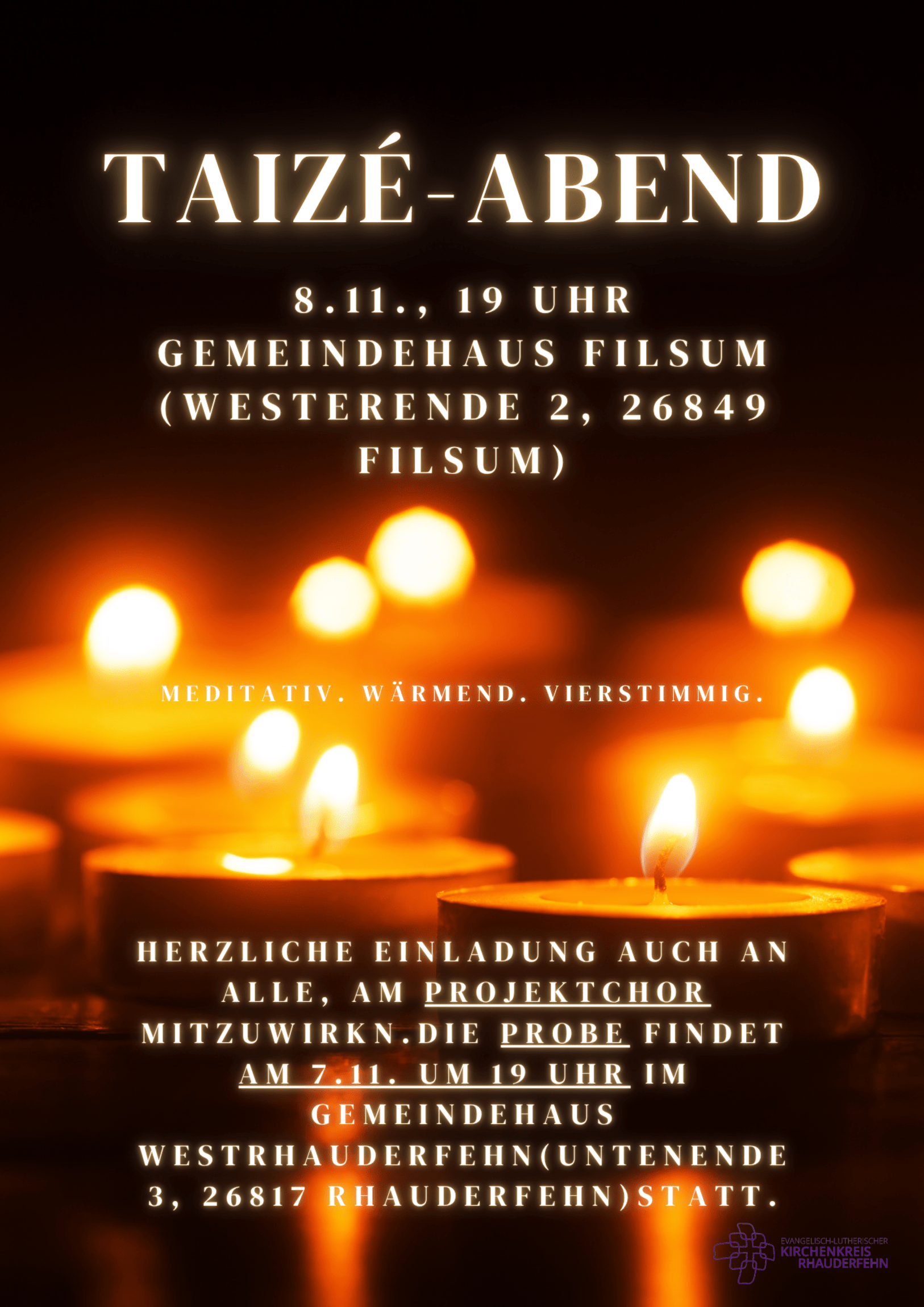 Ein kirchenkreisweites, wunderschönes Projekt findet auch in diesem Jahr wieder in Filsum im Paulushaus statt: Nämlich ein Taizé-Abend am 8. November um 19 Uhr! Dieser typische Gesang ist in Filsum ja nicht fremd und nimmt einen einfach mit hinein in eine wunderbare Stimmung freudiger und bedächtiger Anbetung! Herzliche Einladung aber auch zur einmaligen Probe des Projektchors für diesen Abend, die am 07.11. um 19 Uhr im Gemeindehaus Westrhauderfehn stattfindet!